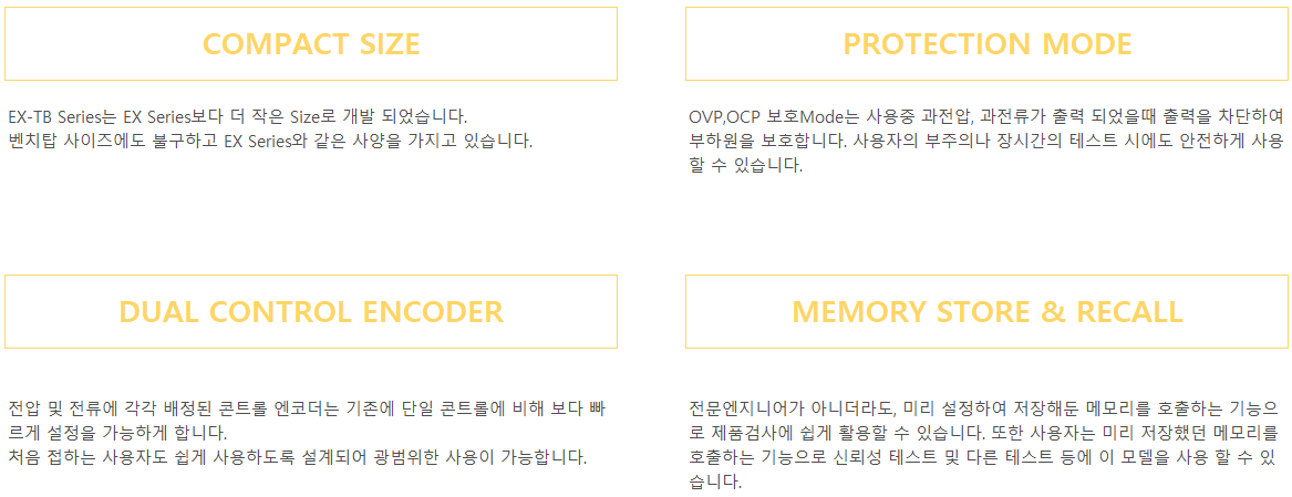 EX-TB Series는 벤치탑 사이즈로 고성능, 고효율 단일 출력의 직류전원 Programmable DC Power Supply입니다. RS-232C, RS-485(RJ-45 Type) Remote Interface를 통한 제어를 위해 SCPI Protocol을 제공합니다. EX-TB Series는 산업현장, 연구소, 교육센터기관 등 여러분야에 걸쳐 사용이 가능한 제품입니다.