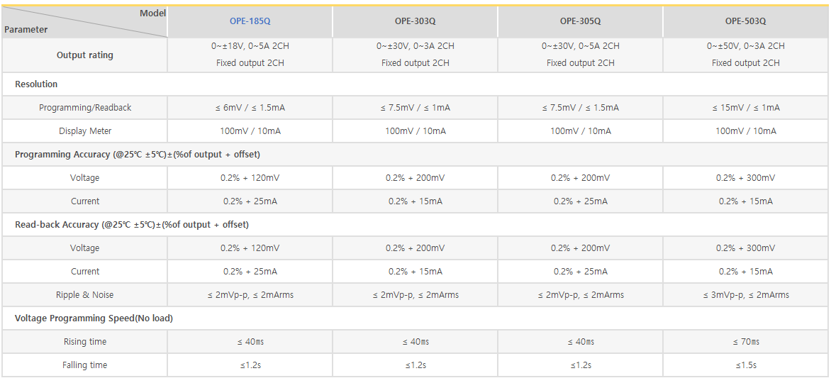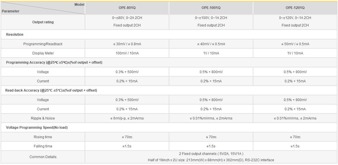 OPE-Q Series는 고효율의 프로그래머블 직류 전원공급장치로써, SCPI (Standard Commands for Programmable Instruments) 프로토콜에 준하는 RS-232C 또는 RS-485통신을 지원하며 Bench-top 뿐만 아니라 19inch Rack에 장착이 가능하도록 설계되었습니다.