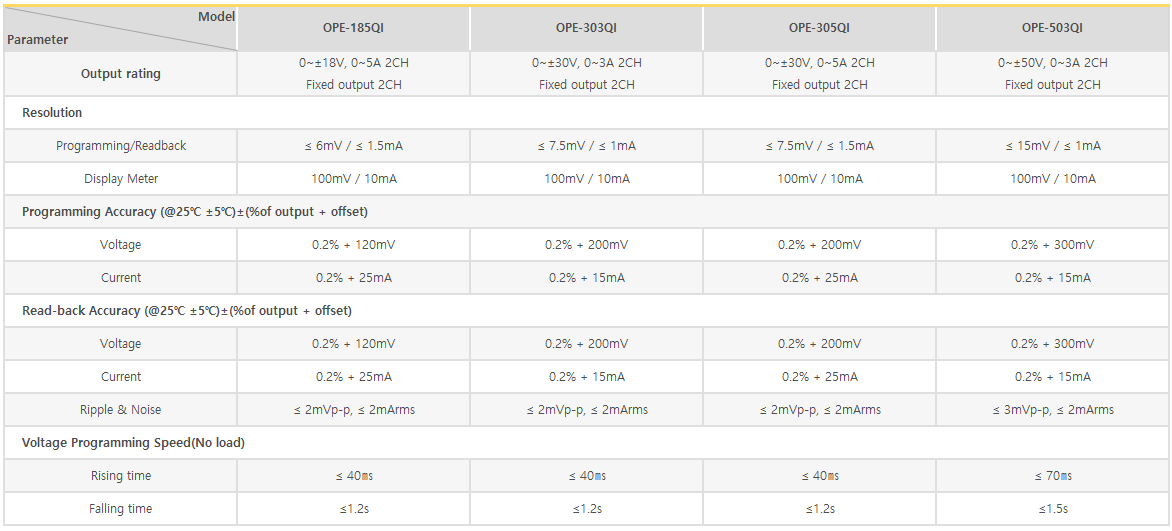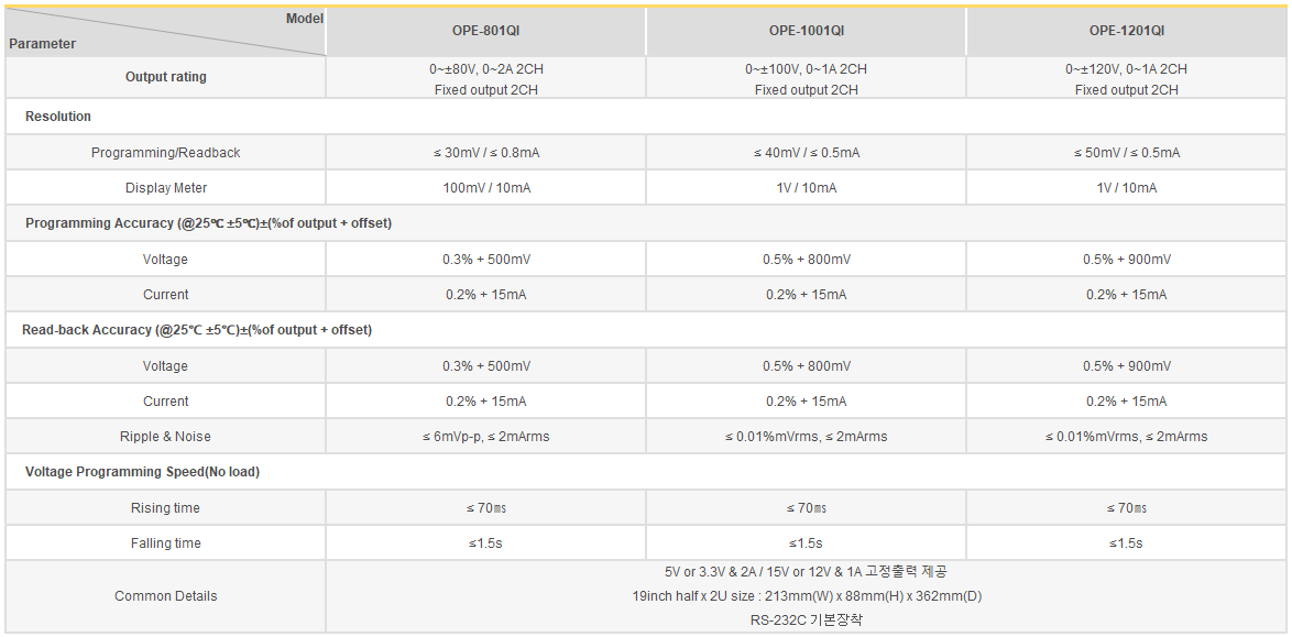 OPE-QI Series 는 고효율의 프로그래머블 직류 전원공급장치로써 SCPI (Standard Commands for Programmable Instruments) 프로토콜에 준하는 RS-232C 또는 RS-485 통신을 또는 RS-485 통신을 지원하며 Bench-top 뿐만 아니라 19inch Rack에 장착이 가능하도록 설계되었습니다. PC Interface기반하에 실험실에서는 분석을, 산업현장에서는 품질관리 등 다목적으로 활용할 수 있습니다.