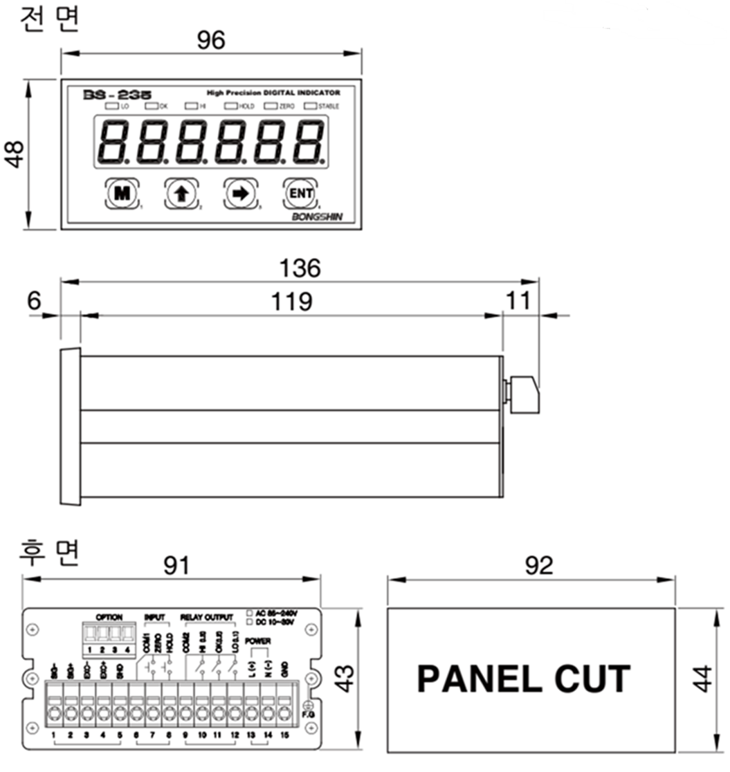 상태표시 LED릴레이 출력 (LO,OK,HI), 홀드 , 영점 , 안정 ,