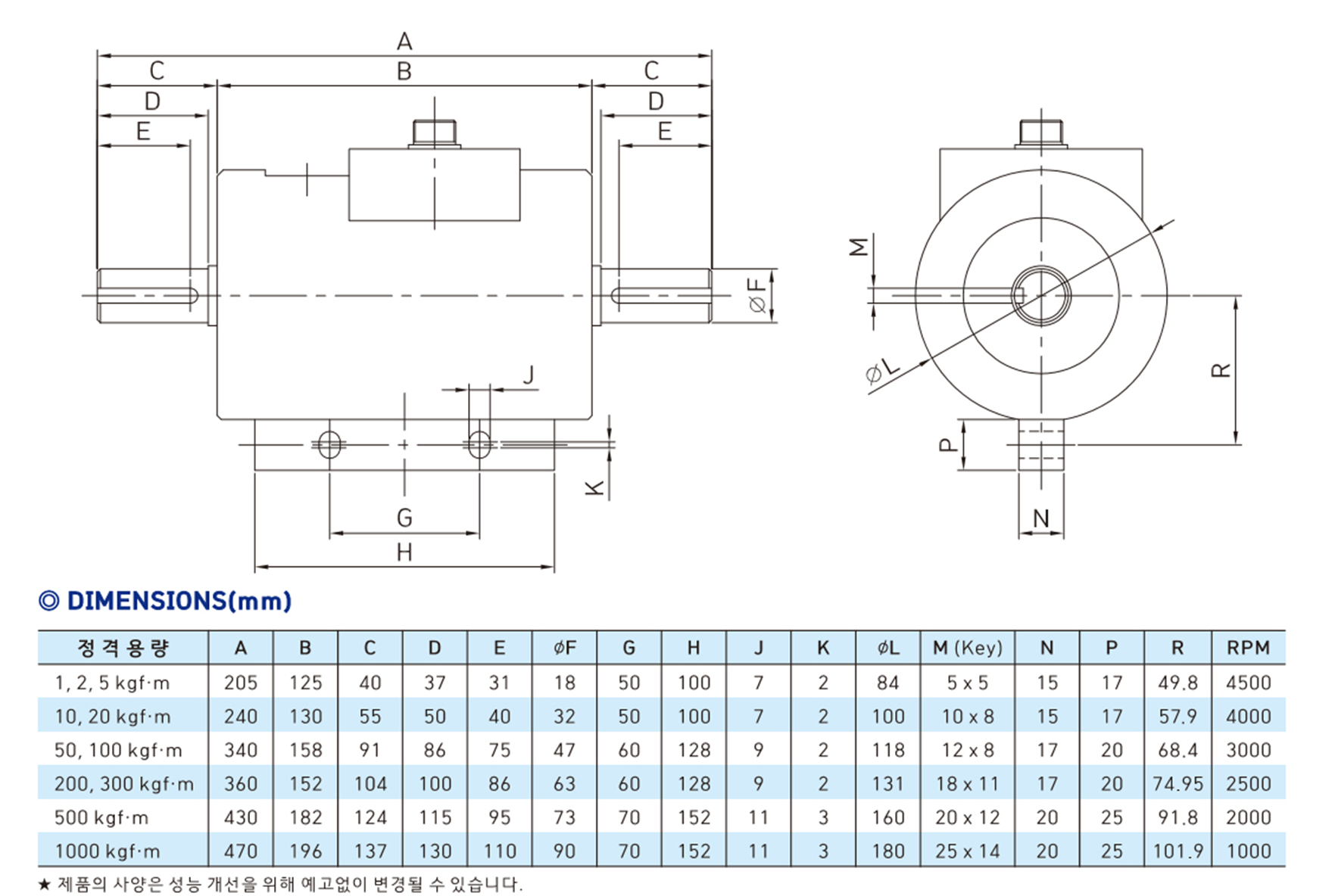 정격용량(R.C.)1,2,5,10,20,50,100,200,300,500, 1000 kgf·m